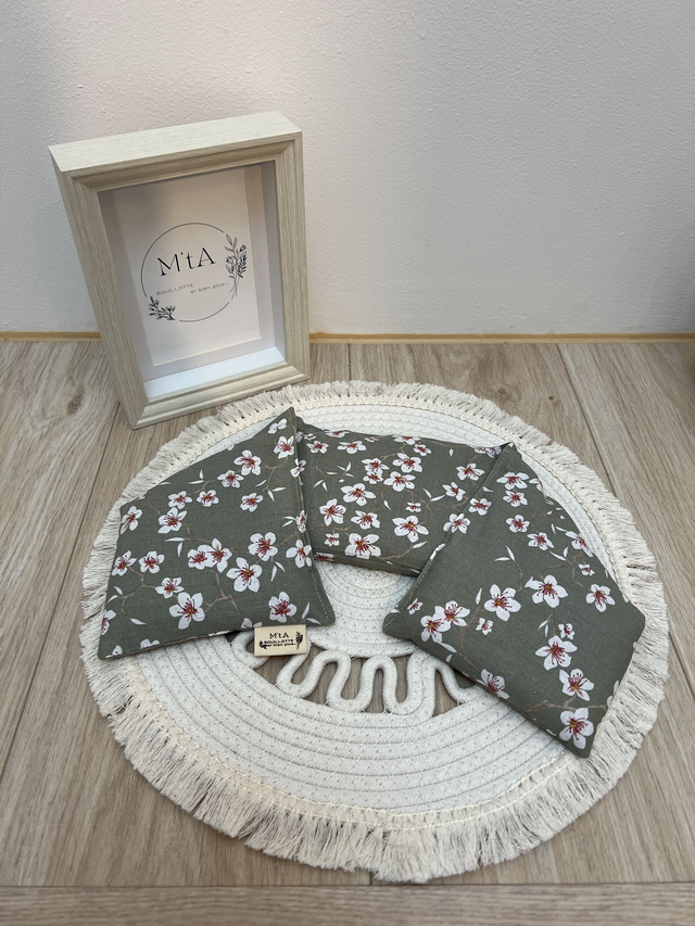 Fabrication artisanale, cousue à la main dans un tissu 100% coton et garnies de graines de lin.